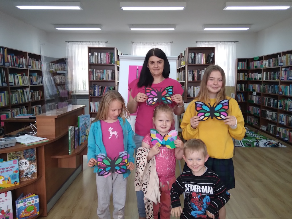 Następnie zapoznały się się z ilustracjami o zwierzętach zamieszkujących łąki, prowadziły dyskusje, a na koniec wykonali witraże kolorowe w kształcie motyli.