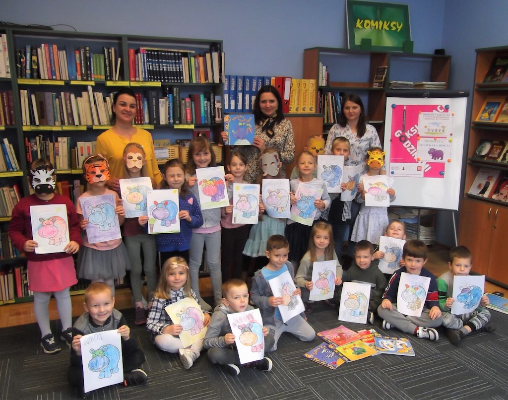 Dzieci wzięły udział w spotkaniu pt. ,,Henrietta – włochata hipcia". Na wstępie odbyła się pogadanka na temat hipopotamów. Dzieci poznały wiele ciekawostek dotyczących tych sympatycznych zwierząt. Klubowicze wykazali się też dużą wiedzą dotyczącą geografii – bez trudu wskazali na mapie świata Afrykę - miejsce, gdzie na wolności żyją ,,wodne konie”. W głównej części spotkania wychowankowie Miejskiego Przedszkola nr 3 bezbłędnie odpowiadali na zagadki o zwierzętach egzotycznych, a później odbyło się głośne czytanie książeczki An Vrombaut pt. ,,Henrietta, włochata hipcia”. Jej bohaterka to wrażliwa istota. która różni się od innych hipopotamów z powodu swojej długiej sierści. Koledzy żartują z niej, dlatego Henrietta postanawia poszukać nowego miejsca do życia. Podczas wędrówki przez pustynię i dżunglę poznaje nowych przyjaciół. Niespodziewanym rozwiązaniem jej problemu jest zmiana uczesania. Po głośnym czytaniu odbyła się dyskusja na temat utworu. Przedszkolaki stwierdziły, że nie należy śmiać się z innych z powodu ich odmienności, gdyż wtedy takiej osobie może być przykro i smutno. Znacznie przyjemniej jest, gdy w grupie panuje zgoda i wszyscy są dla siebie mili.. Następnie przyszedł czas na zabawę ruchową pt. ,,Wędrówka przez Afrykę”, a potem zajęcia plastyczne pt. ,,Nowa fryzura Henrietty”. Na zakończenie wszyscy uczestnicy zajęć pozowali do pamiątkowego zdjęcia. Dziękujemy za mile spędzony czas i do zobaczenia za miesiąc.