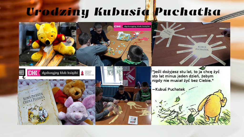 14 października 1926 roku ukazało się pierwsze wydanie książki „Kubuś Puchatek” autorstwa A.A. Milne’a, napisanej dla syna Krzysia. Na październikowym spotkaniu DKK, rozmawialiśmy o tej właśnie książce. W 95 urodziny Kubusia przeczytaliśmy jeden z rozdziałów, w którym Kłapouchy obchodzi swoje urodziny i dostaje dwa prezenty. Pierwszy od Kubusia – pustą beczułkę po miodzie, drugi od Prosiaczka – pęknięty balonik. Osiołek bardzo się ucieszył z życzeń i podarunków, które do siebie pasowały. Beczułka była na coś, co można było do niej włożyć, a balonik był właśnie tym czymś.