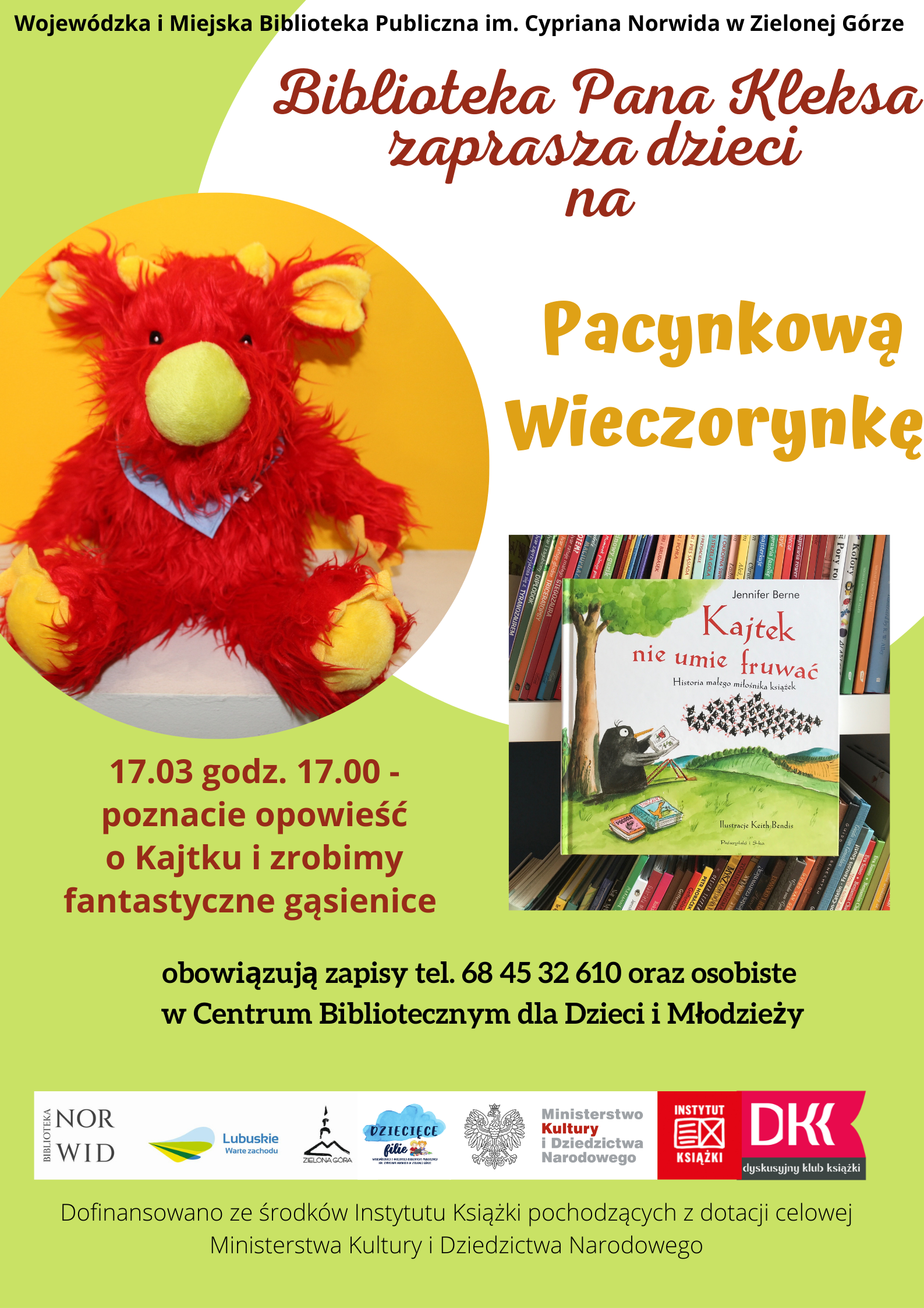 Uroczy, pacynkowy potworek Rysiu przeczytał najmłodszym czytelnikom książkę „Kajtek nie umie fruwać. Historia małego miłośnika książek.” Berne Jennifer.