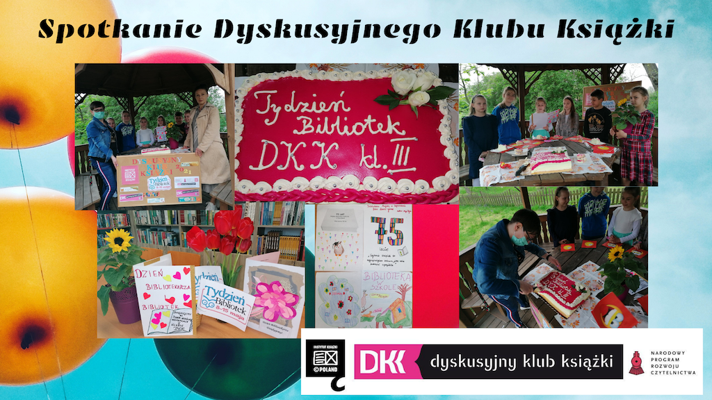 Z tej okazji uczniowie klasy trzeciej wraz z wychowawczynią panią Anną Dudra-Światowską przygotowali szczególnie smaczną niespodziankę. Nasza dyskusja rozpoczęła się od życzeń i słodkiego poczęstunku w postaci tortu, którego upiekła mama uczestniczki DKK. Bardzo dziękujemy za to pyszne ucztowanie. Klubowicze w tym roku obchodzą trzecią rocznicę uczestnictwa w tym zacnym towarzystwie. Podzieliliśmy się naszymi odczuciami oraz przemyśleniami, jakie dały nam nasze comiesięczne zebrania. Dzieci przyznały, że bardzo chętnie odwiedzały ulubioną książnicę i z radością upajały się literaturą przeznaczoną dla nich.